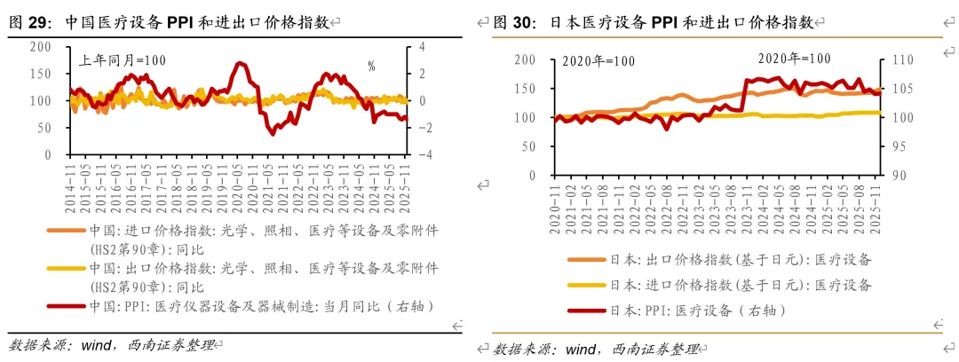 从日本医疗设备PPI和进出口价格指数来看,日本医疗设备出口价格指数自2021年起脱离基期,开启陡峭的上升通道,指数值从约100升至2025年11月的140以上。这主要因为日本高端医疗设备在全球范围内享有技术溢价,需求具有刚性。医疗设备PPI与出口价格指数同步上升,从2023年底开始强劲反弹,持续创出新高,显示景气已传导至国内生产端,企业盈利能力得到巩固和增强。进口价格指数走势相对平稳,在100-110的区间内温和波动,表明日本医疗设备行业的供应链相对稳定,进口成本可控。后续出口价格指数和PPI预计保持温和上涨,进口价格指数或延续区间震荡格局。
