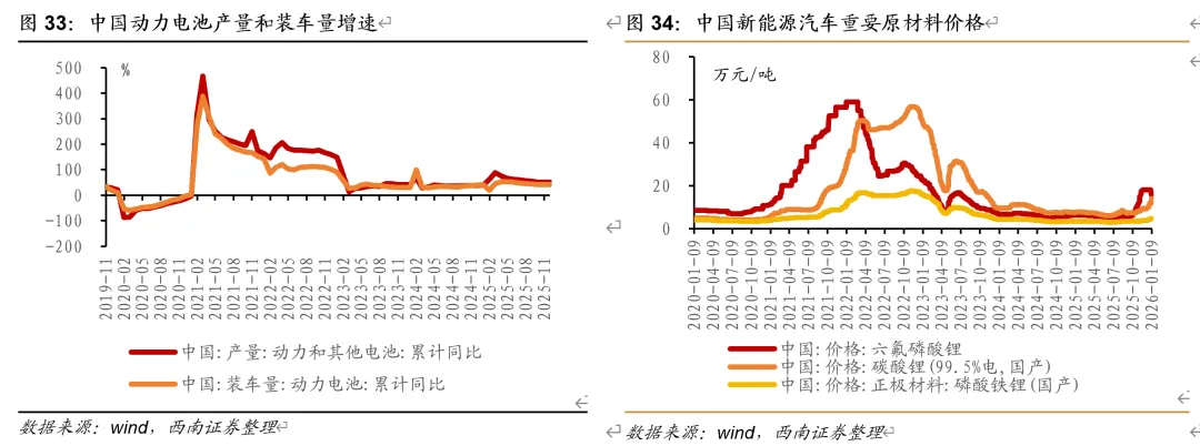 从我国新能源汽车重要原材料价格来看,2020年末-2022年中,在新能源汽车需求爆发背景下,三种材料价格呈现暴涨。六氟磷酸锂作为电解液核心材料,价格弹性最大,涨幅最大。2022年中-2024年,随着产能大规模释放、下游去库存及需求增速放缓,价格开启断崖式下跌,行业进入产能出清阶段。2024-2025年,价格在深度下跌后,于低位呈现宽幅震荡,三种材料价格走势实现基本同步。三种材料价格在经历了长期磨底后,于2025年底至2026年初均出现同步小幅抬升,显示持续的低价已迫使部分高成本产能退出或减产,行业供给边际改善。同时,下游电动车与储能市场的绝对需求量仍在增长,对价格形成支撑。后续原材料价格或在核心成本区间附近震荡后企稳。