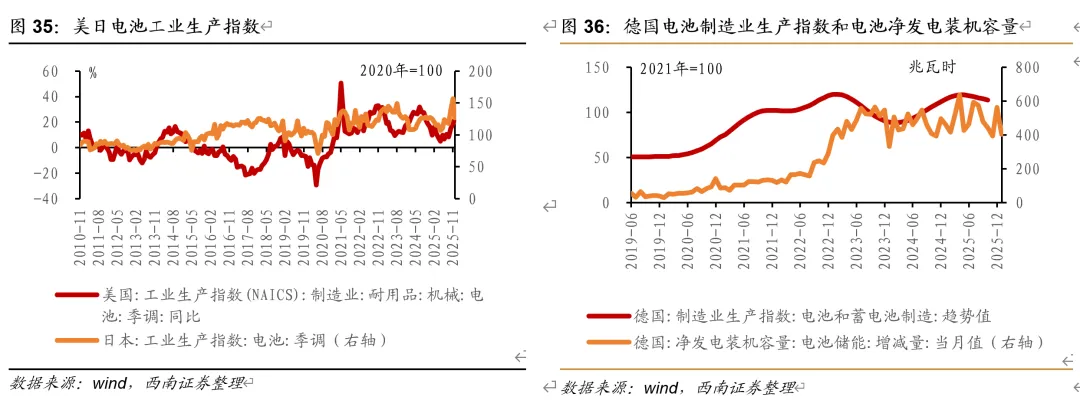 从美国和日本的电池工业生产指数来看,美国电池工业生产指数同比增速在 2020-2021年经历了一轮由疫情后需求回升和电动车热潮驱动的暴涨,增速一度超过50%。此后指数波动下滑并进入低位增长区间。这表明美国本土电池制造业在经历了初期的投资热潮和产能规划后,大规模产能建设尚未完全转化为实际产出。后续该指数大幅反弹需等待现有产能充分释放和新一轮政策或需求刺激。日本电池工业生产指数自2020年因疫情触底后,开启了一轮稳健的上升趋势,目前已远超2020年基准水平。这反映了日本电池产业凭借其在上游高端材料的深厚积累,正迎来收获期。后续指数有望延续当前上升趋势,将更多反映其高端材料产能的释放和固态电池等新技术的产业化进度。