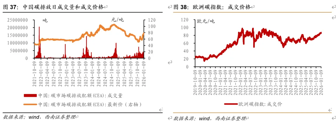从欧洲碳指数成交价格来看,价格从2019年的约20欧元/吨启动,开启长期上升趋势。此后在冲高至100欧元/吨左右的历史峰值后大幅回调,于50欧元/吨上方获得支撑,目前已回升至接近90欧元/吨的高位。当前价格在高位区间运行,主要由于“Fit for 55”一揽子计划确定了更陡峭的年度配额削减斜率,配额总量加速收紧。同时,碳边境调节机制的实施使得免费配额逐步取消,工业部门的实际购买需求大幅增加。未来碳价或震荡上行,主要取决于配额供给和政策推进进度。