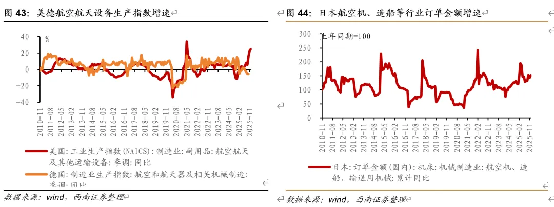 从美德两国航空航天设备生产指数增速来看,2020年疫情导致全球航空运输接近停摆,产业链断裂,两国生产指数均出现断崖式下跌。随后在财政刺激、货币宽松及需求释放的推动下,两国指数均转正并持续运行于零轴上方。2025年以来,美国航空生产指数同比出现较强反弹,目前已升至历史较高水平。这表明美国航空航天制造业的需求复苏强劲,产能利用率和生产活动活跃,指数在短期内或维持高景气。德国航空生产指数于2025年以来出现下探迹象,或因行业复苏受到欧洲航空市场恢复慢、能源成本高企以及供应链挑战等制约,未来指数或延续低位震荡走势。