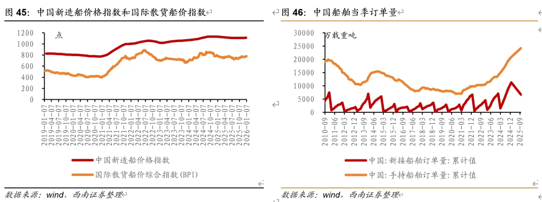 从我国新造船价格指数和国际散货船价指数来看,两者走势基本一致,自2021年以来经历了一轮持续上涨,并且于2022年后进入高位平台期并维持至今。新船价格反映了船厂手持订单饱和度和未来收入预期,当前的价格指数表明船厂产能饱和支撑了价格刚性。市场对未来新增订单的增速预期已趋于理性,价格缺乏大幅上涨的新动能。BPI反映即期航运市场的供需和运价水平,波动幅度相对更大,当前的平稳状态证明航运市场主要受正常贸易需求和政策驱动,BPI走势后续或保持稳定。