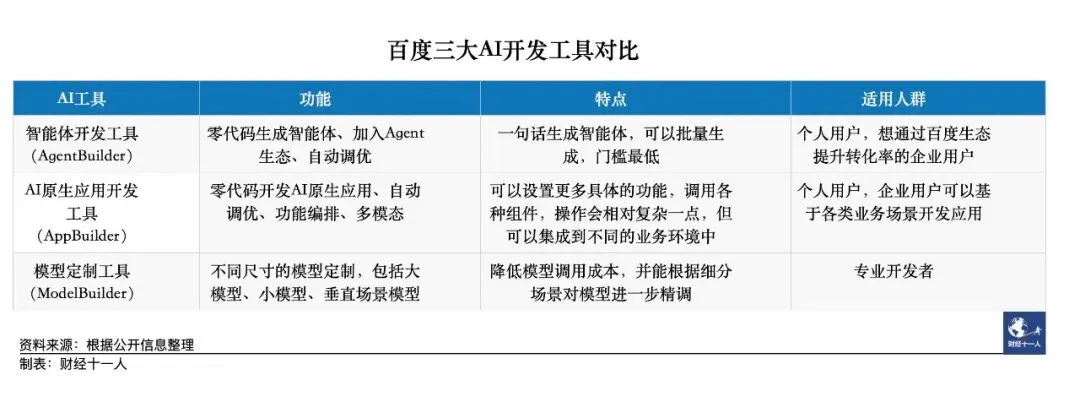 2023年是百度在AI大模型狂奔的一年,根据2023年财报各项数据,百度也是国内最先享受到新一代AI技术带来商业红利的公司之一。今年,这家公司的新重点是大模型开发生态的建设。2024年4月16日,百度创始人、董事长兼首席执行官李彦宏在Create 2024百度AI开发者大会上提到了一个新说法:“只要会说话,你就可以成为一名开发者”。开发者也好,程序员也罢,这个职业多多少少存在普通人很难一蹴而就的专业门槛。大模型的一个核心功能是生成代码,过去一年多时间里,关于“大模型是否会取代程序员”的讨论一直没有停歇。目前的进展来看,对于大部分不懂代码的人来说,用大模型开发应用依然有门槛。这是行业的新痛点,也是百度的新机会。李彦宏认为,这样的门槛应该被进一步削低。至于如何削低门槛,百度的方式是在这次大会上发布三个AI开发工具,智能体开发工具(AgentBuilder),AI原生应用开发工具(AppBuilder)和模型定制工具(ModelBuilder),希望能进一步削低应用开发门槛,最终实现“人人都是开发者”目标。AgentBuilder是三个工具套件中门槛最低的套件。它可以实现“一句话开发”,无论是专业的企业开发者,或是不懂代码的个人,都可以用一句话建立自己的智能体。例如,家长输入“创建一个小学数学老师”,就可以生成一个用于辅导小孩功课的智能体。智能体相当于大模型中的应用插件,可以同时生成多个,并协同工作。 AppBuilder同样不需要开发者有专业代码能力,使用自然语言就可以开发应用。开发者可以通过给应用起名、填写应用功能、插入工具组件,三个步骤就可以生成一款应用。ModelBuilder则更适合于专业开发者,主要用于根据不同需求定制不同尺寸的模型,并根据细分场景对模型进行精调。百度在其中预置了多种大模型,包括百度自研的文心3.5和文心4.0和多个轻量级大模型,以及国内外第三方的主流大模型,共计77个。今天,调用大模型的成本依然高昂,在不同流程中使用大小不同尺寸模型搭配,可以帮助开发者控制成本。百度于2023年3月推出文心一言大模型,百度的最新数据显示,文心一言用户数量目前已经超过2亿,API(应用程序接口)日均调用量超过2亿次,服务客户约8.5万。这意味着中国每100个人里,有14个人在使用文心一言。用户量的稳定上升,支撑了API调用和客户数据的提升。