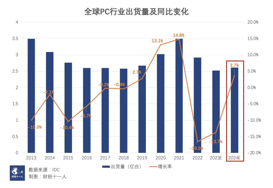 如果再把时间轴往前拉,2011年,全球PC出货量创造了3.65亿台的纪录,而这是往后十几年的“巅峰”。在此之后PC市场技术发展缓慢、需求逐渐疲软,从增量市场转为存量市场,除了2021年新冠肺炎疫情首年的“短暂性春天”。