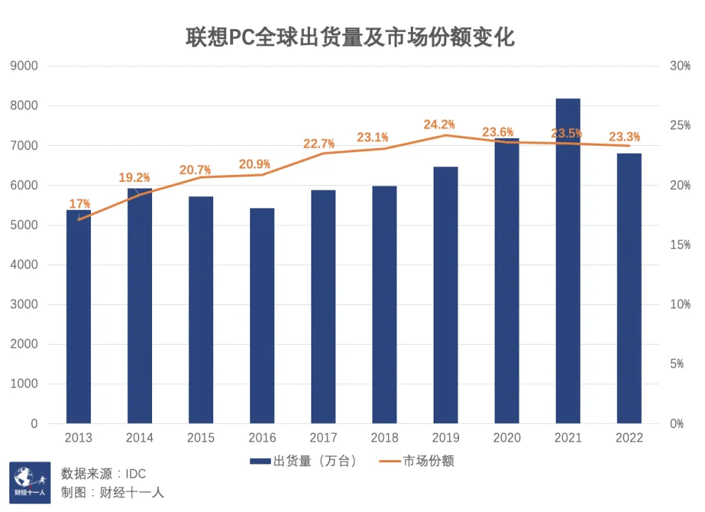 联想踏准了上两轮周期:1999年联想推出“天禧”因特网电脑,从此走上开挂之路;2004年12月8日,联想宣布收购IBM公司的全球个人电脑业务,豪掷12.5亿美元,换来了一个国际化的新联想。此后,联想成为全球PC市场的主流玩家,2012年问鼎全球PC之冠。最新数据显示,2023年三季度,联想依然以1600万台的PC出货量位列第一,市占率环比提高0.4%至23.5%。而在中国大陆地区,Canalys数据显示,联想以36%的市场份额稳居第一,PC出货量超过第二至五名总和。