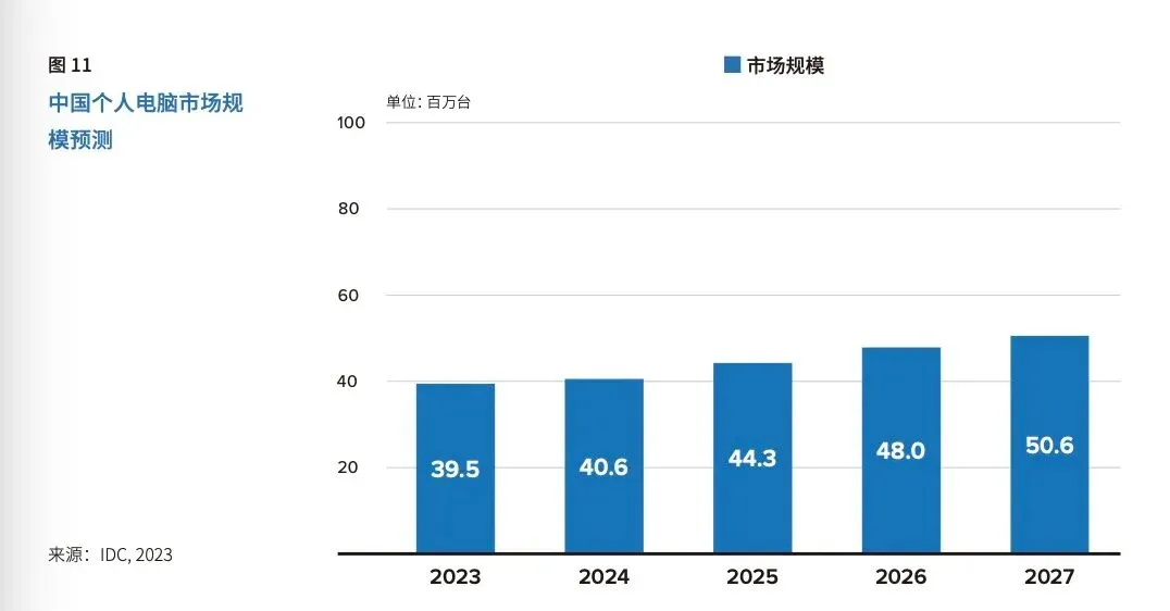 IDC预测,中国PC市场将因AI PC的到来结束负增长,在未来五年中保持稳定的增长态势。台式机与笔记本电脑市场总规模将从2023年的3800万台增至2027年的5000多万台,增幅达到32%。