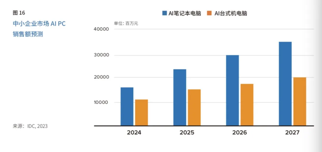 另外,未来五年在中小企业市场,销售额AI笔记本电脑高于AI台式电脑,AI 笔记本电脑和AI台式电脑合计销售额将从2023年的32亿元快速攀升至2027年的547亿元,增长16倍。