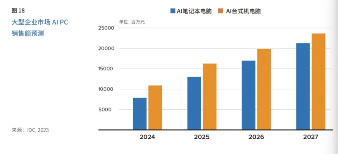 IDC预测,未来五年在大型企业市场,AI笔记本和AI台式机将并驾齐驱,同步普及。AI笔记本电脑和AI台式电脑合计销售额将从2023年的2.3亿元快速攀升至2027年的449亿元,增长191倍。