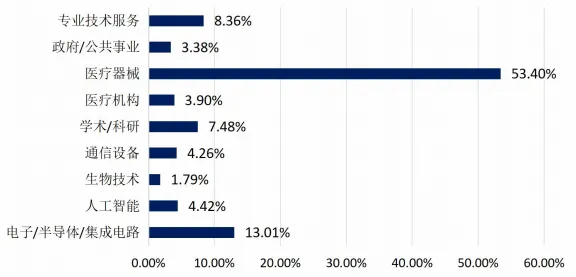 从产业发展角度分析,医疗器械领域吸纳了 53.4% 的岗位需求,成为人才最密集的领域;电子 / 半导体、人工智能领域紧随其后,占比超 13% 和 4%,凸显技术交叉特性,见图2。