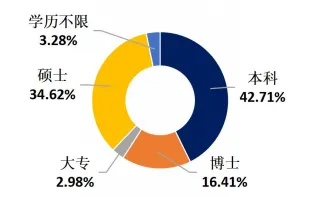 脑机接口产业人才高学历层次人才需求占比高,调研脑机接口岗位以本科层次要求为主,占比 42.71%;硕士比例岗位需求约占本次调研的4.62%,博士学历要求的岗位占比为 16.41%,大专学历层次岗位占比仅为 2.98%。