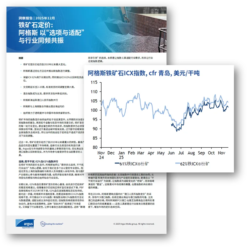 过去一年,铁矿石定价经历了自2010年以来最重大的转型。基准产品品位的变化重塑了市场格局,迫使行业及其定价机制进行调整。阿格斯在与市场紧密合作的基础上审慎采取行动,优化海运及港口指数以反映新现实,并为市场参与者提供符合当前需求的工具。