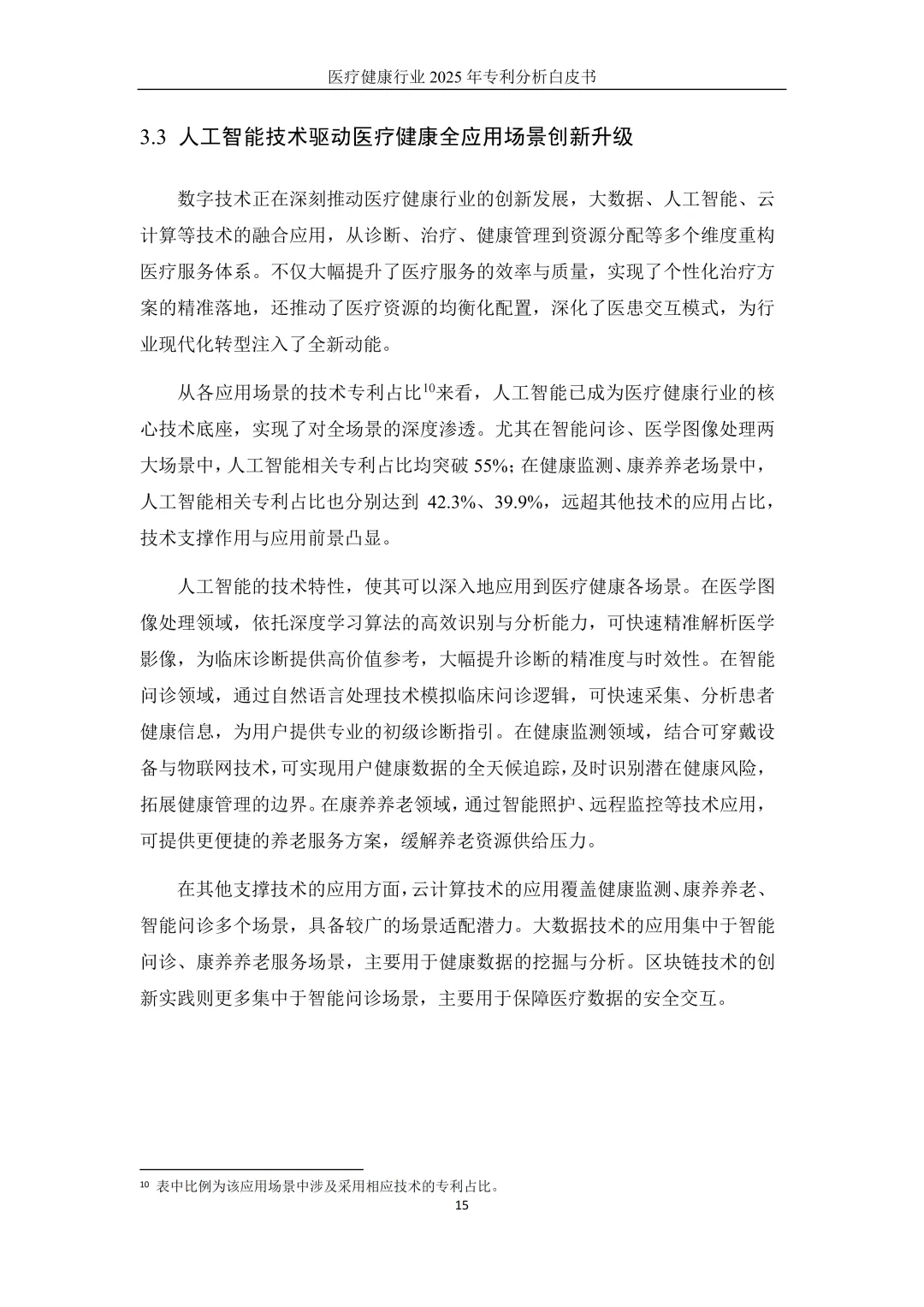 人工智能是支撑全场景创新的核心技术底座,已实现对各应用场景的深度渗透。智能问诊、医学图像处理场景中,人工智能相关专利占比均超55%;健康监测、康养养老场景中占比也分别达到42.3%、39.9%,技术支撑作用与商业化应用前景显著领先其他技术。