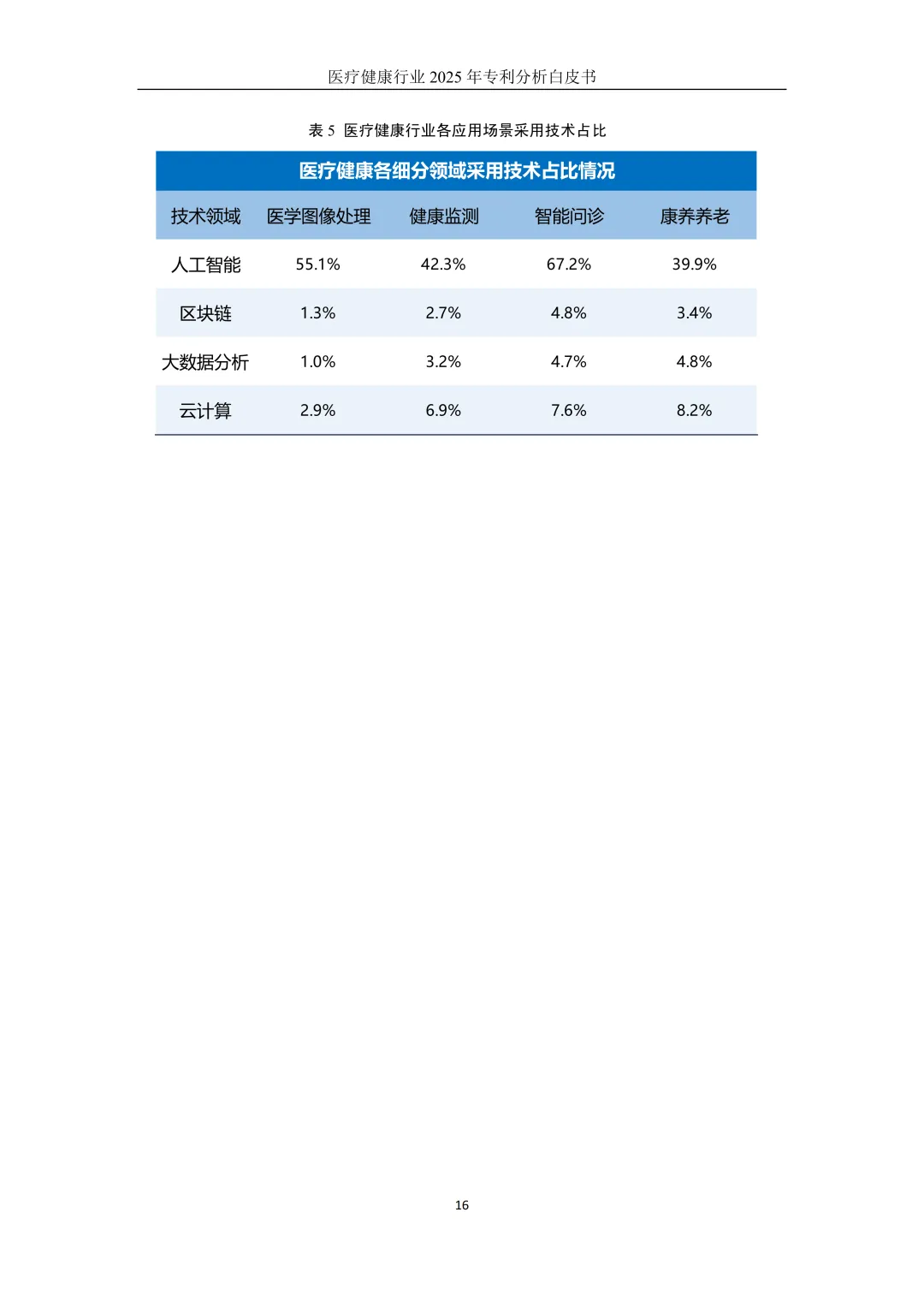 全球医疗健康行业人工智能相关技术专利申请量超18万件,占行业总申请量的39.3%,相比之下,云计算、区块链、大数据等技术的行业支撑作用相对有限。