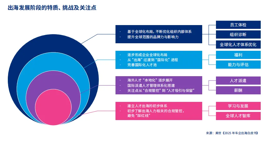 车企出海的人才配置需经历四个发展阶段:初级阶段高度依赖总部外派员工,管理重心是设计完善的派遣体系,确保人才 “选得出、派得动、用得好、回得来”;成长阶段本地员工比例持续上升,管理重点转向深度本地化,包括设计有竞争力的本地薪酬体系、尊重本地文化习俗;国际化阶段找到中外人才配置的最优平衡点,形成总部外派骨干与本地化专业团队高效协同的全球化队伍;全球化阶段则构建成熟的全球人才流动与管理体系,实现人才资源的最优配置。