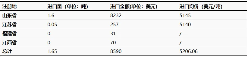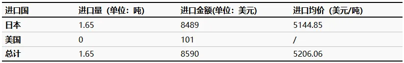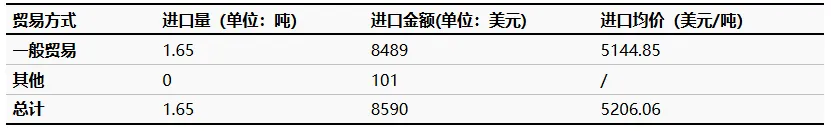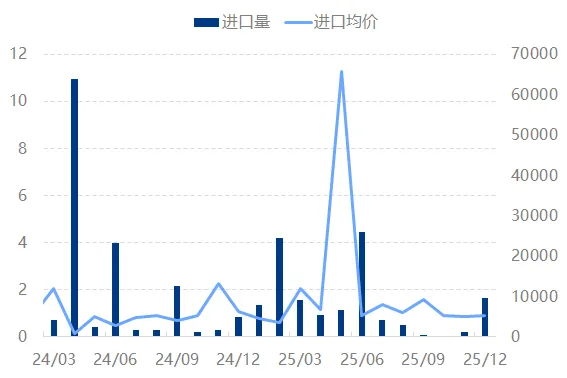 2025年1-12月累计进口量为16.85吨,较去年同期减少4.2吨,降幅为19.77%。