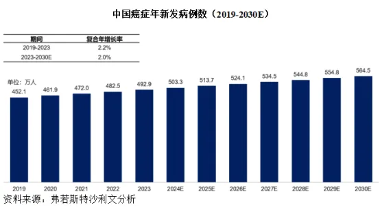 中国癌症新发病例数整体呈上升趋势,在2023年达到了492.9万人,2019年-2023年复合年增长率达到2.2%。预计中国新发病例数在2026年将会达到524.1万例,到2030年达到564.5万例,2026年-2030年复合年增长率为2.0%。