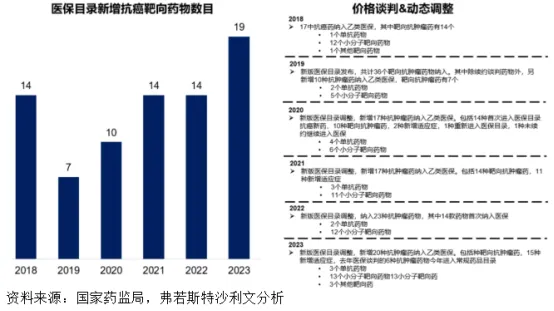 2017版医保目录首次将小分子靶向抗肿瘤药纳入医保范围,并且卫健委和人社部等分别在2017年、2018年和2019年和2022年进行了药品谈判,将更多的靶向抗肿瘤药纳入医保报销范围。2020版、2021版、2022版和2023版医保目录再次更新,抗肿瘤药物仍是国家医保谈判的重点内容。