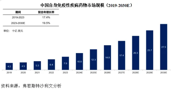 基于中国庞大的人口,中国自身免疫性疾病药物市场将拥有庞大的患者群。随着国内自身免疫性疾病诊断技术的发展和完善,市场规模从2019年的42亿美元扩张到2023年的79亿美元,复合年增长率为17.4%。未来几年医疗服务的市场需求将受到刺激,预计2026年整体市场规模将达到148亿美元。预计到2030年,中国自身免疫性疾病药物市场规模将达到275亿美元,复合年增长率达到19.5%。