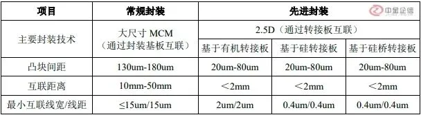 3)实现集成芯片的主要封装技术:集成芯片中,需要使用到封装技术将芯粒(Chiplet)集成制造为芯片。根据国内行业组织发布的标准,实现集成芯片的主要封装技术包括通过封装基板实现芯片之间信号互联的常规封装(大尺寸MCM),以及通过转接板实现芯片之间高密度信号互联的先进封装(2.5D),具体如下: