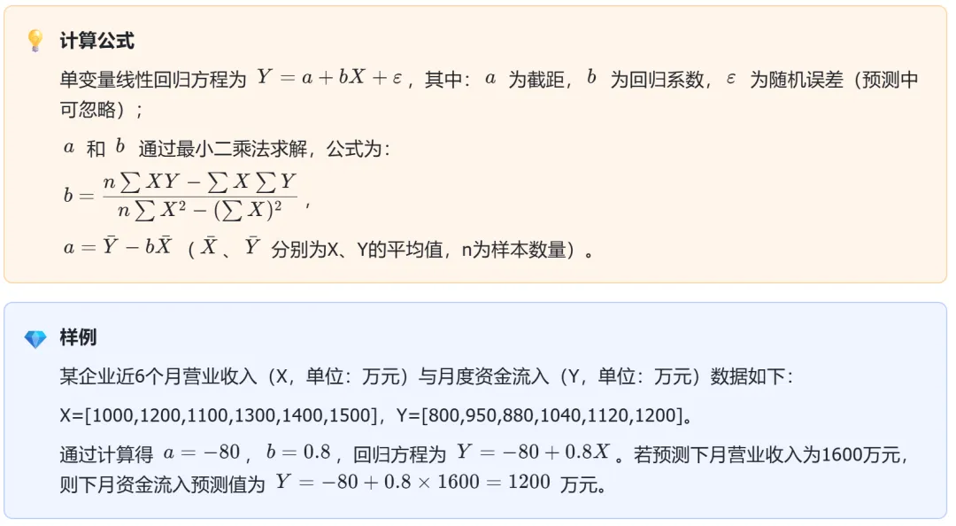 假设资金流动量(因变量Y)与某个或多个影响因素(自变量X,如营业收入、采购支出、月度天数等)存在线性相关关系,通过拟合线性方程,根据自变量的未来取值预测资金流动量。适用于影响因素单一、数据线性趋势明显的场景(如稳定经营企业的月度资金流入预测)。