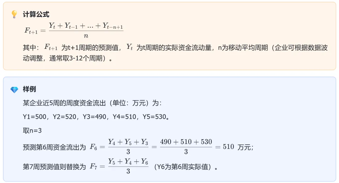 基于“近期数据对未来预测更具参考价值”的核心,选取连续n个周期的历史资金流动数据,计算其平均值作为下一个周期的预测值,滚动更新(删除最早周期数据,加入最新周期数据)。适用于资金流动平稳、无明显趋势和季节波动的场景(如日常运营资金的周度预测)。