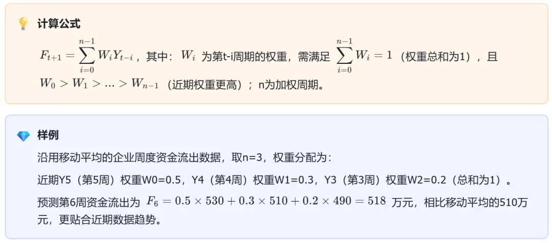 在移动平均的基础上,对不同周期的历史数据赋予不同权重(近期数据权重更高,远期数据权重更低),通过加权求和计算预测值,弥补移动平均“平等对待所有数据”的不足,提升预测精准度。适用于资金流动略有波动,但趋势相对稳定的场景。
