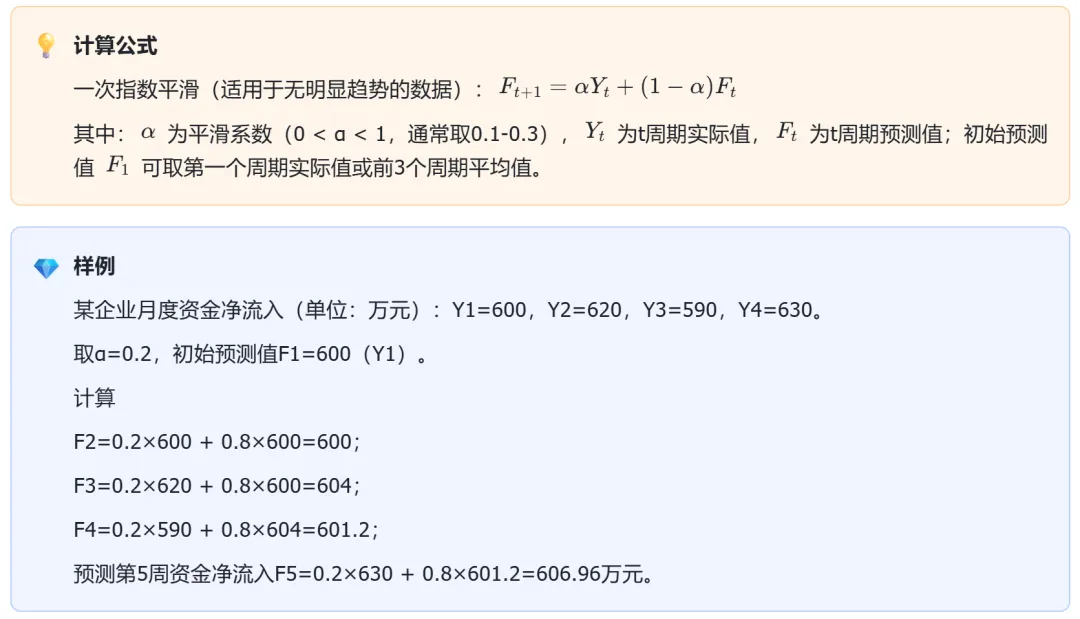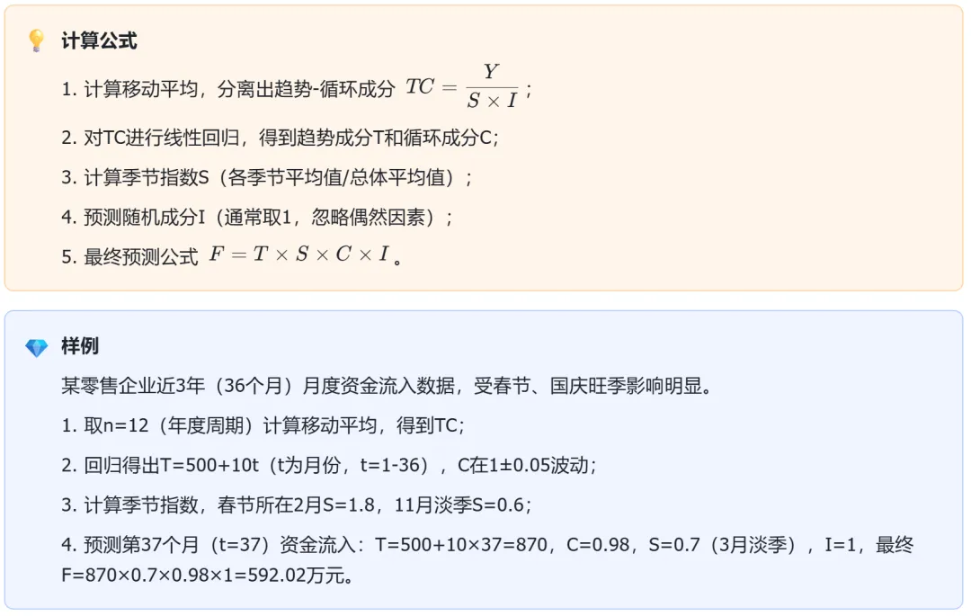 以下12种预测方法均基于企业历史资金流水、应收应付数据、经营指标等可获取数据,明确逻辑原理、计算公式,并结合司库资金流动性场景给出样例,确保企业可直接落地应用。