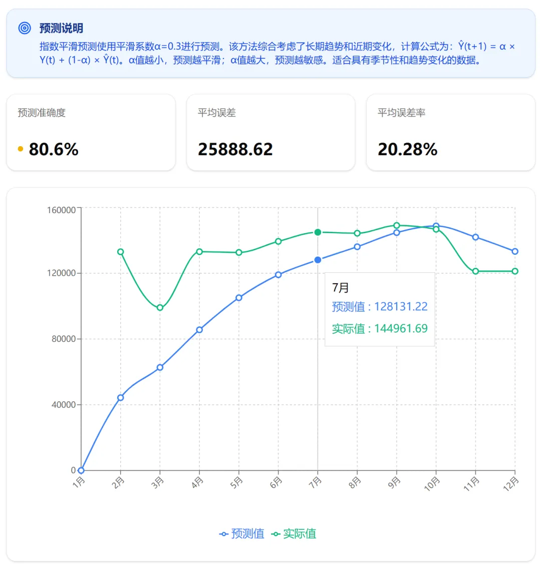 一种改进的加权平均方法,仅需利用上一周期的实际值和预测值,结合平滑系数(α)计算当前预测值,无需保留大量历史数据,计算简便且能动态调整。核心是通过α平衡历史预测误差与最新实际数据的影响,α越大,对最新数据的反应越灵敏(适用于波动较大的数据);α越小,预测结果越平稳(适用于波动较小的数据)。