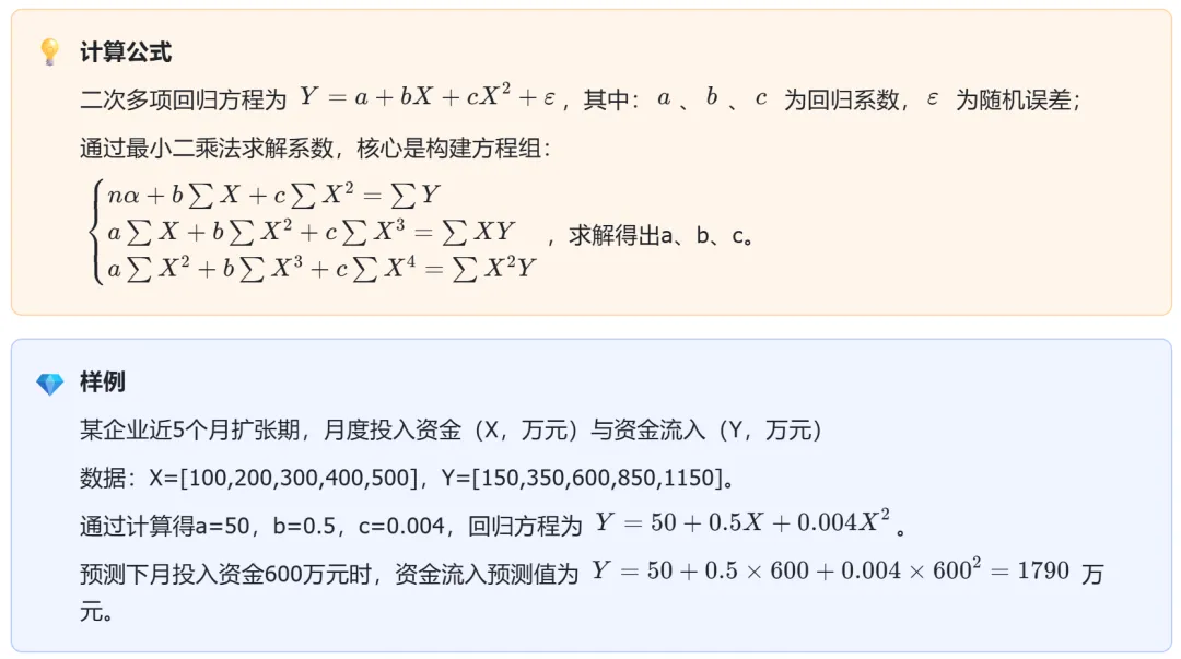 当资金流动量与影响因素呈现非线性趋势(如抛物线趋势)时,采用二次多项式拟合数据关系,构建二次回归方程进行预测。适用于资金流动呈现明显上升/下降抛物线趋势的场景(如企业扩张期的资金流入预测)。