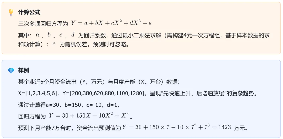 逻辑与原理:在二次回归的基础上,增加三次项($$X^3$$),拟合更复杂的非线性资金流动趋势(如先上升、再平稳、后下降的趋势),适用于资金流动趋势波动较大、非线性特征明显的场景(如企业旺季、淡季交替且存在长期战略调整的资金预测)。