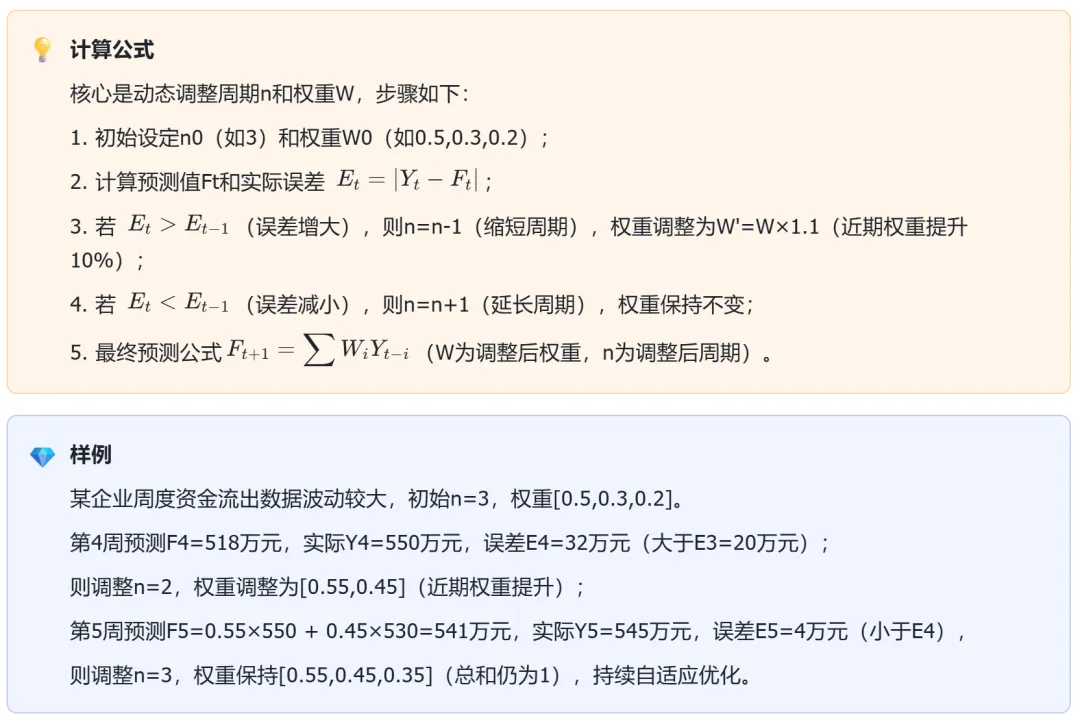 改进的移动平均方法,无需人工设定固定周期n,而是根据历史预测误差的大小,动态调整预测周期和权重,实现“自适应”匹配资金流动的波动变化。当预测误差较大时,缩短周期、加大近期数据权重;当误差较小时,延长周期、保持权重稳定。适用于资金流动波动不稳定、难以提前设定固定周期的场景。