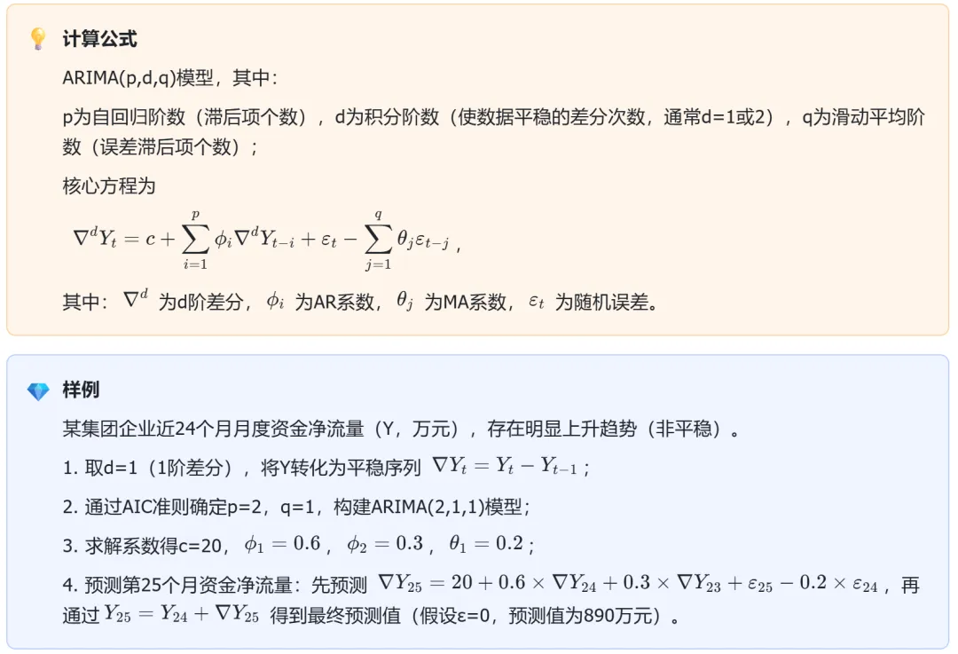 核心逻辑:通过“积分”操作将非平稳数据转化为平稳数据,再通过AR模型捕捉数据自身的滞后关联,MA模型捕捉随机误差的滞后关联,从而实现精准预测。适用于资金流动复杂、存在趋势和随机波动的场景(如集团企业整体资金流动性预测)。