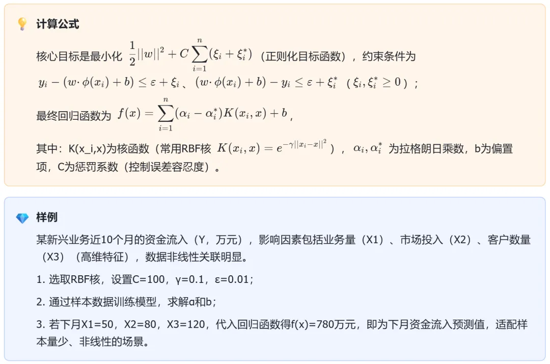 SVR(Support Vector Regression,支持向量回归)是基于SVM(Support Vector Machine,支持向量机)的回归方法,核心是通过非线性映射将资金流动数据(输入特征X)映射到高维特征空间,找到最优超平面,使预测值与实际值的偏差控制在允许范围内(ε-不敏感损失函数),适用于高维数据、非线性关系明显、样本量较少的资金预测场景(如新兴业务的资金流动性预测)。