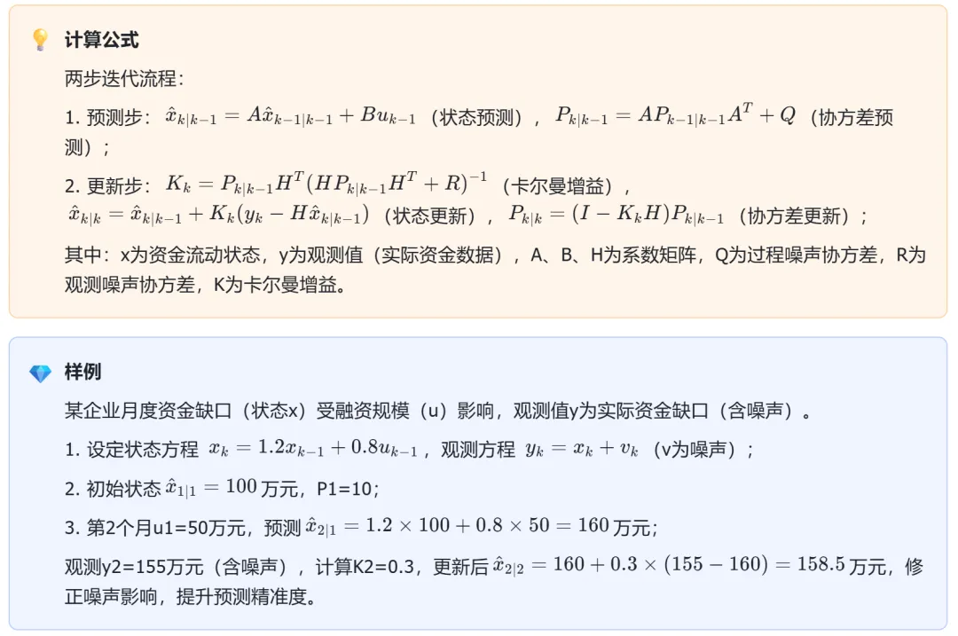 一种动态递推滤波方法,核心是通过“预测-更新”两步迭代,结合系统状态方程和观测方程,实时修正预测误差,适用于动态变化的资金流动场景(如受宏观经济、政策调整等动态因素影响的资金预测)。