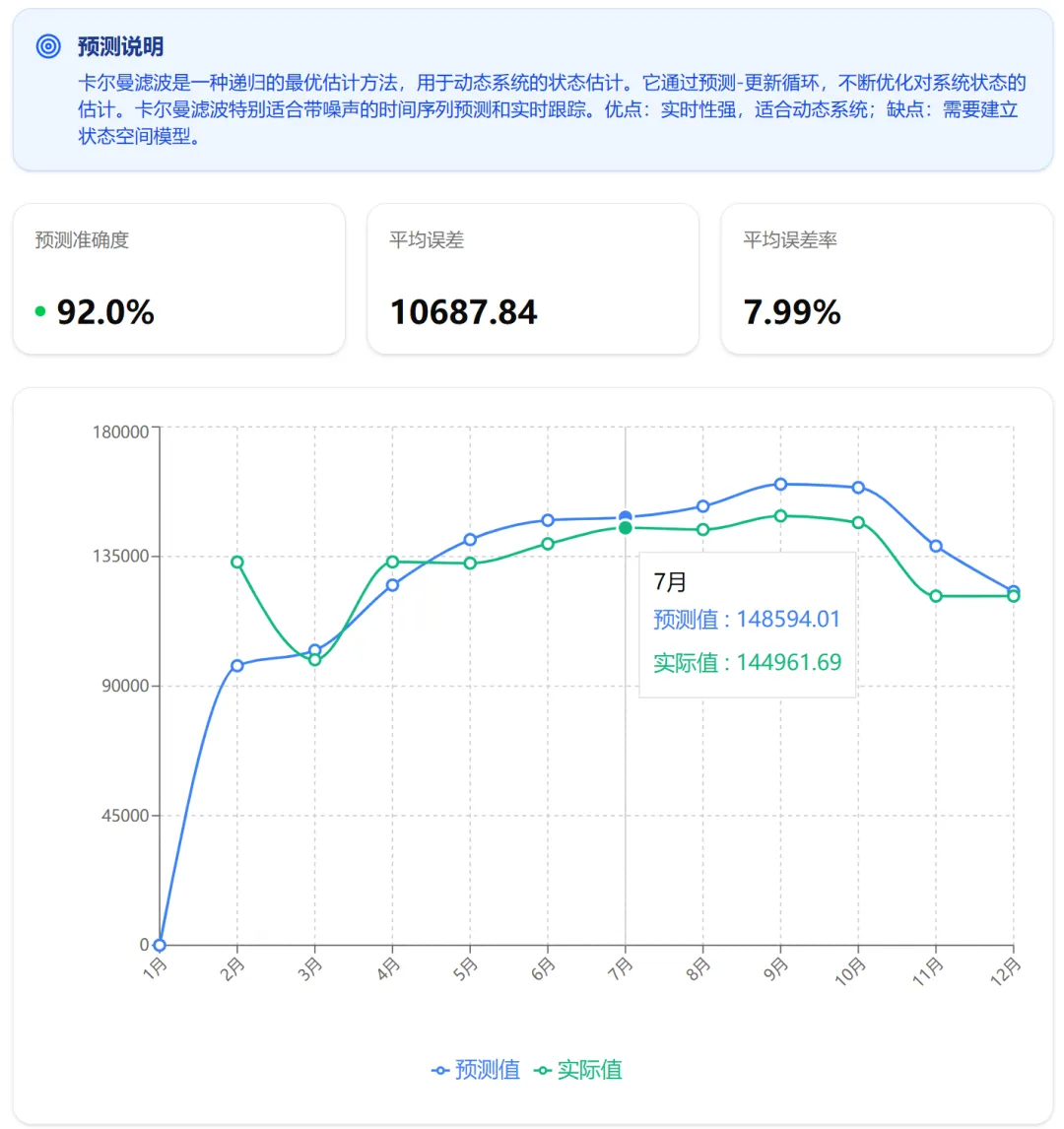 得出的结果如下图所示。我们发现虽然AI智能预测平均准确率91.98%和传统【卡尔曼滤波】预测平均准确率92% 相比有一些细微差距,但是在AI智能预测中,每个月的预测结果和真实结果更为接近。