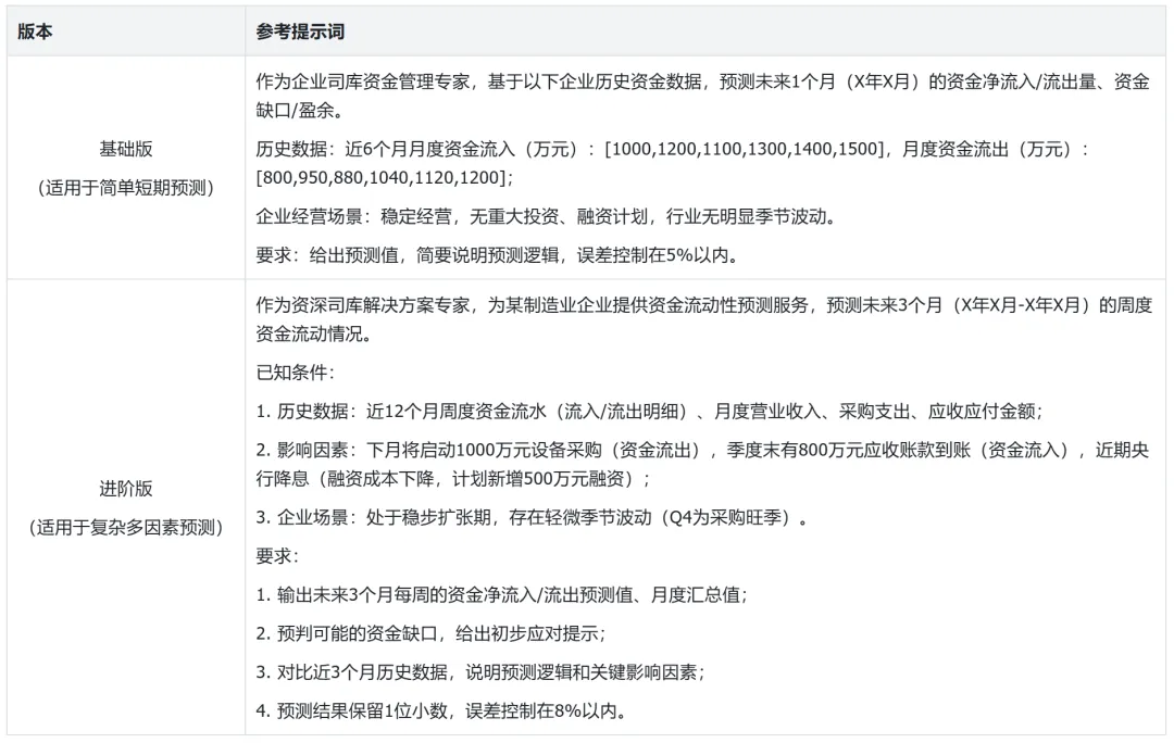 提示词设计(适配司库资金流动性预测,分基础版、进阶版,可直接复制使用,替换括号内企业实际数据):