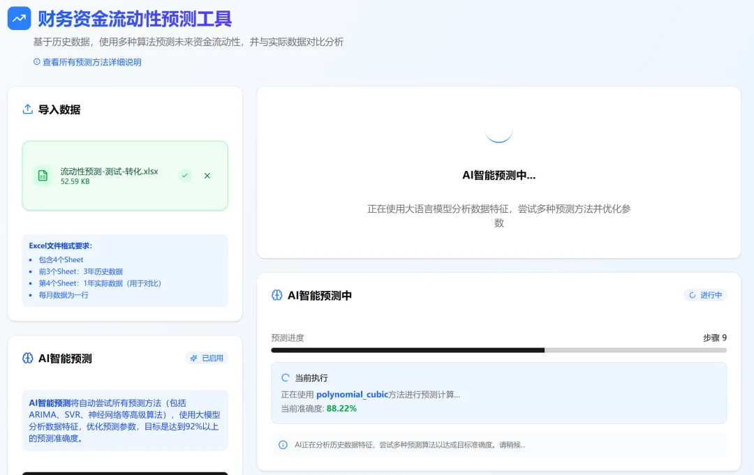 在我们的【财务资金流动性预测工具】中,选择预测方法为【AI智能预测】,AI智能预测会根据我们预先设定的参数,不断尝试各种预测方法,最终选择最优值。由于涉及大量的运算,比较耗时,也比较消耗计算机的资源。