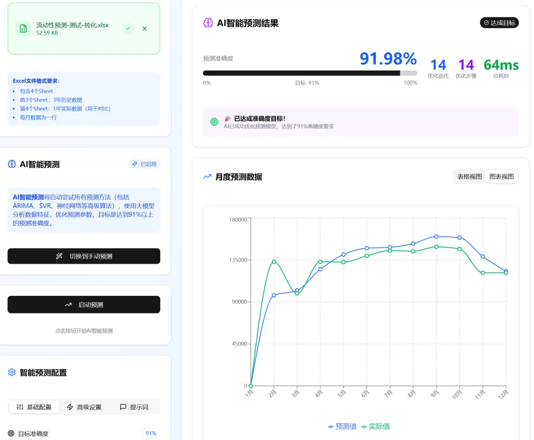 升级预测系统,中小企业逐步过渡到标准版系统,中型企业引入多方法融合模式(如“线性回归+季节分解”“ARIMA+SVR”),大型企业对接AI大模型接口,实现传统方法与大模型的初步融合;完善数据范围,增加外部数据(宏观、行业)的采集和应用;优化预测报表和可视化仪表盘,满足管理层汇报和决策需求;拓展预测应用场景,将预测结果与资金调度、融资管理结合,实现价值转化。