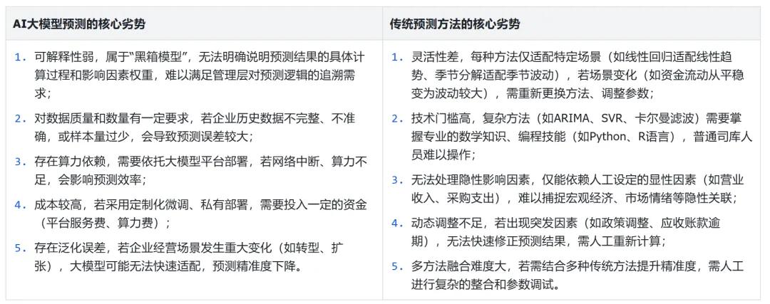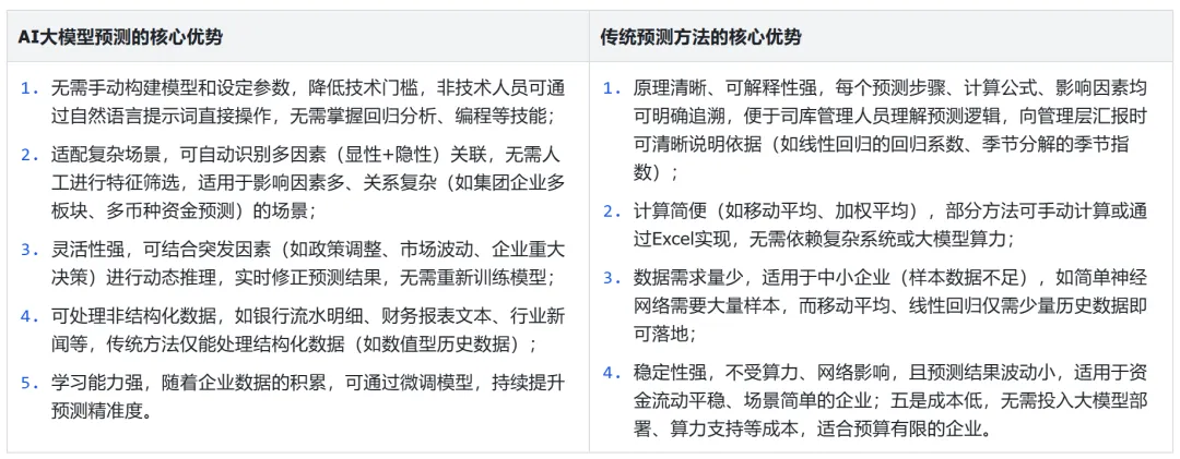 传统预测方法更适合:中小企业,资金流动平稳、场景简单,样本数据不足、预算有限,且需要清晰的预测逻辑、可解释性的场景。
