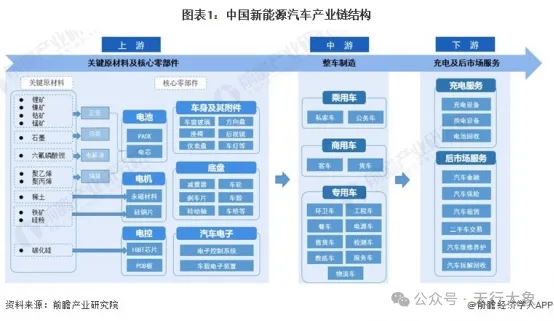 上游:核心原材料及零部件供应,主要包括锂、钴等电池原材料,以及电池、电机、电控三大核心零部件,是产业链的基础支撑。