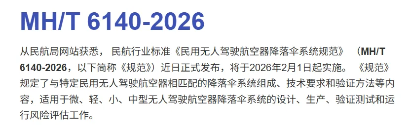 2月1日起,《民用无人驾驶航空器降落伞系统规范》正式施行,无人机降落伞彻底从“选装建议”变成了“合规刚需”!不再是可安可不安的佛系选择,而是商业飞行、闹市区等高风险场景下的硬性要求,核心覆盖250克以上的无人机,其中25公斤以上更是强制安装,少一步都可能违规。