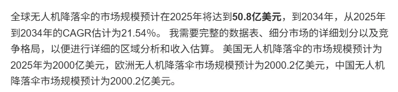 更重要的是,这个赛道的红利还在持续释放。一方面,无人机的应用场景还在不断拓展,农业、安防、城市服务等领域对商用无人机的需求只增不减,对应的降落伞需求也会同步攀升,另一方面,随着行业规范化,降落伞的生产、测试、适配会形成更完善的产业链,从核心部件研发到整机配套,每个环节都有分羹的机会。