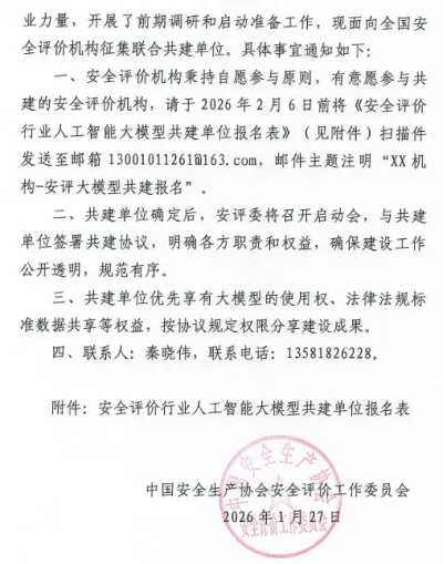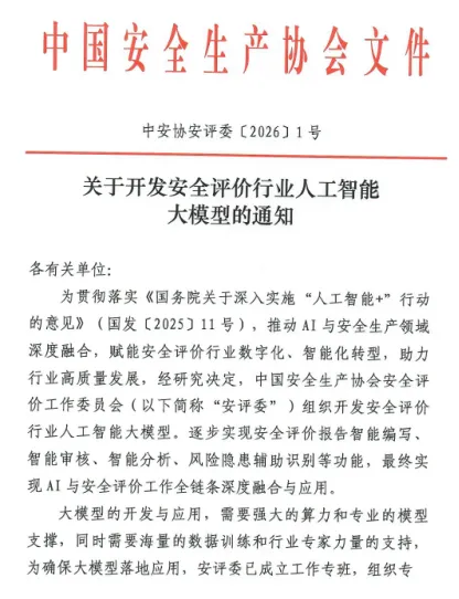 巧了!27日,中国安全生产协会发布了一个通知,征集单位参与安全评价行业人工大模型开发工作,目的是逐步实现安全评价报告智能编写、智能审核、智能分析、风险隐患辅助识别等功能。如果能实现此目的,那么广大安全评价行业工作者和报告审核专家应该有危机感。