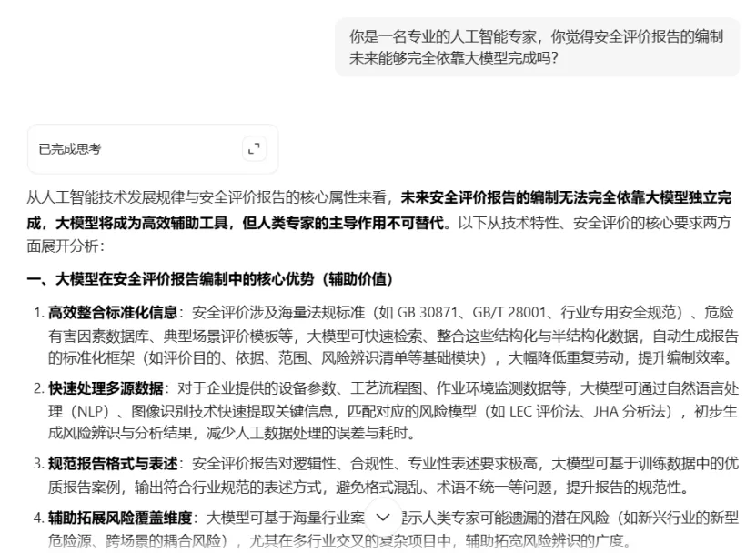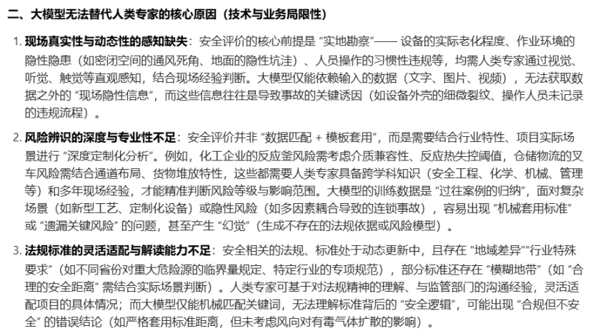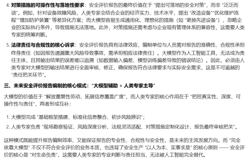 依托大模型对编制完成的安全评价报告审核,对于找错别字、格式问题、语句表达问题、评价依据完善度等重复性劳动,大模型做的实在是太完美了!但是对于危险有害因素辨识全面性、评价结果准确性、对策措施针对性,大模型似乎不那么灵光,如果让大模型结合安全评价报告失实或重大缺陷情形进行审核,很难满足审核要求。