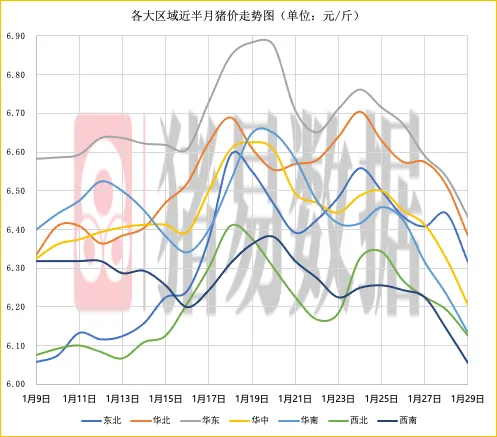 东北、华北、西北、华中、华东、西南、华南地区猪价呈现下跌,生猪平均价格跌幅扩大。