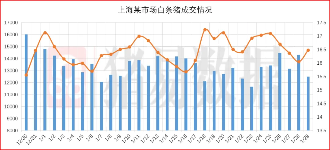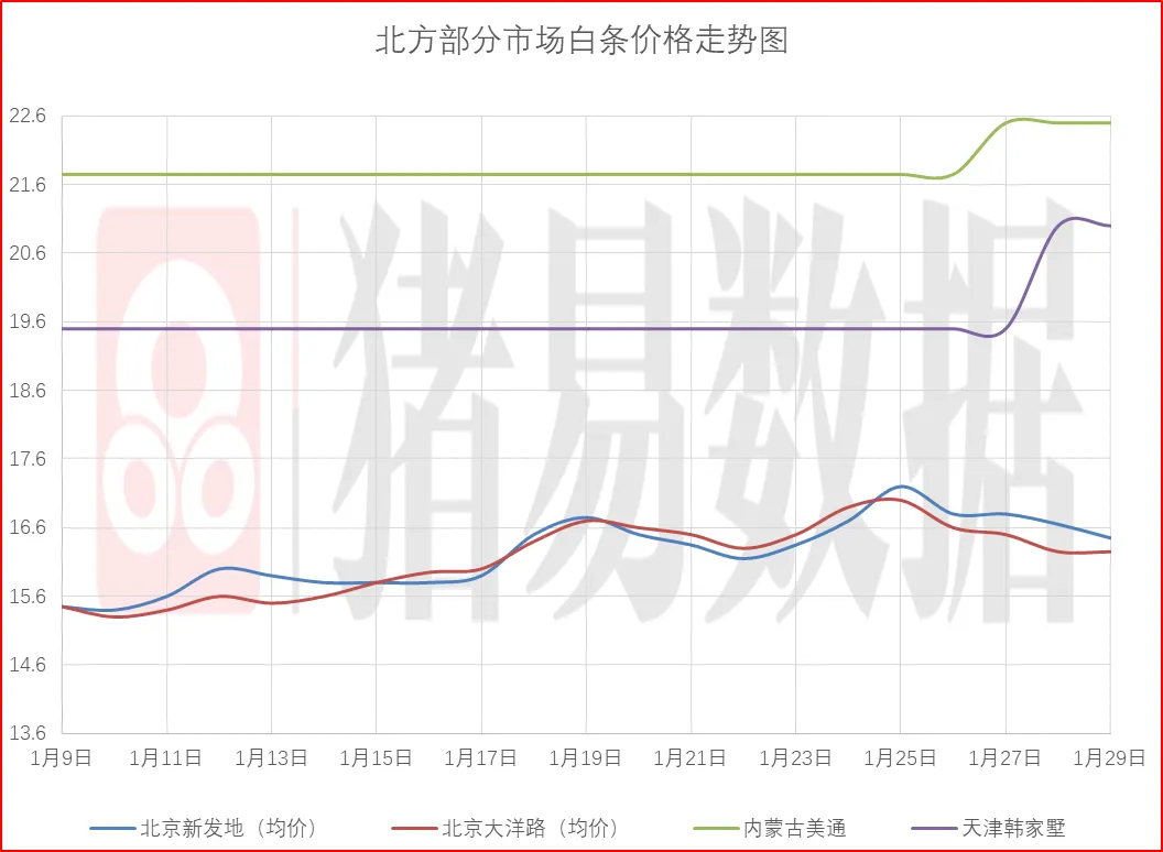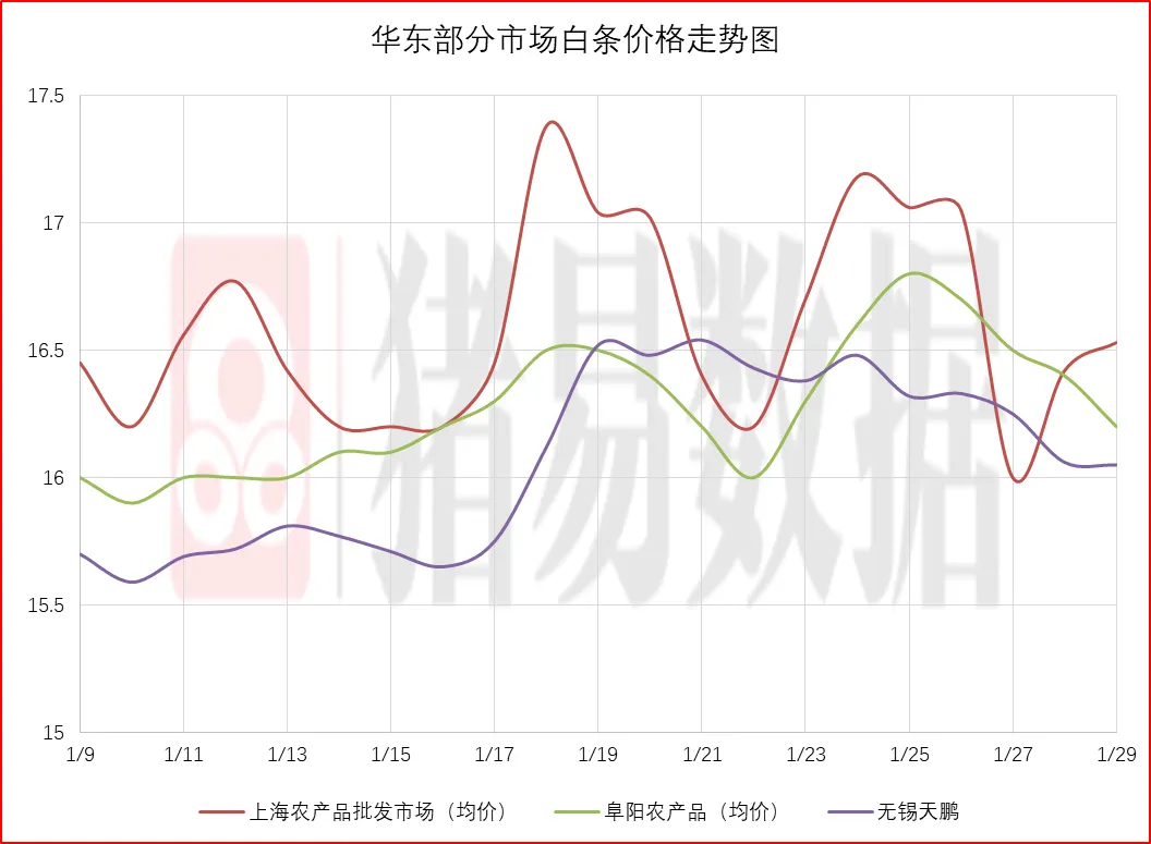 从今日北京、上海消费城市批发市场白条价格走势来看,北京、上海批发市场白条开磅价格呈现跌涨调整,北京大部分市场开磅价格下跌0.2元/公斤,市场走货速度表现一般偏差;上海市场价格呈现上涨,部分市场成交价参考16.48-16.53元/公斤,到货量表现有所减少,市场交易情绪表现偏差,市场成交均价表现一般。