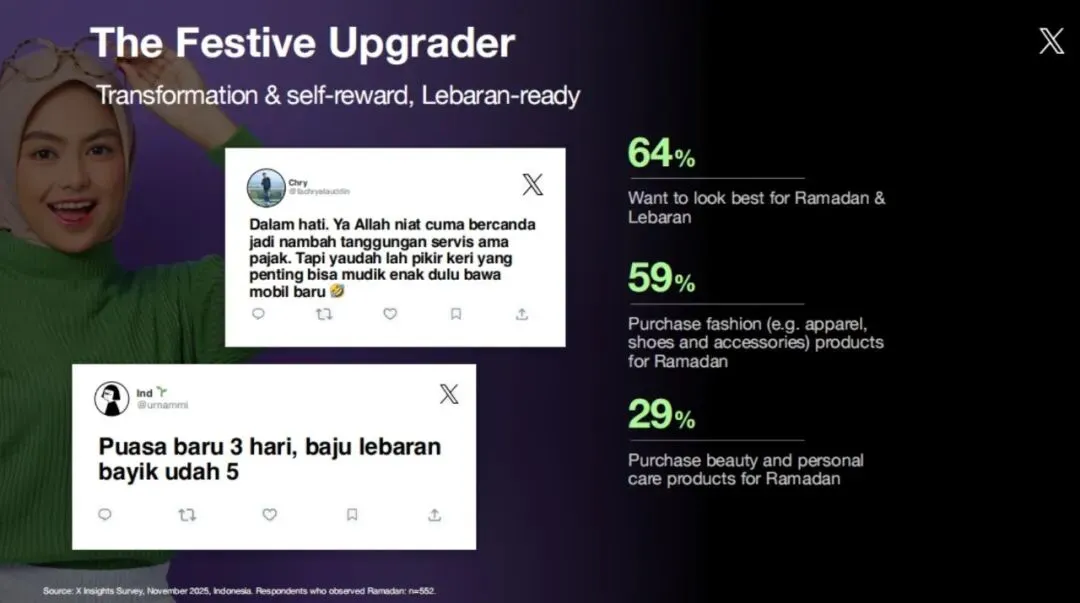 而在这场持续一个月的集体叙事中,X 正成为品牌与用户建立真实对话、实时互动、深度共鸣的关键场域。数据显示,仅2025年斋月期间,印尼 X 平台关于斋月的对话量就突破530万条,年同比增长21%,形成了一个既活跃又多元、既传统又现代的社交舆论场。