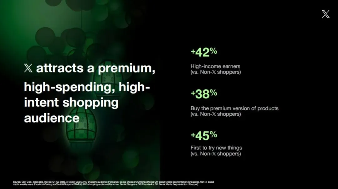 高价值受众:X 上的购物者中,高收入者比其他平台多42%,更愿意购买高端产品(+38%),更乐于尝试新品(+45%);