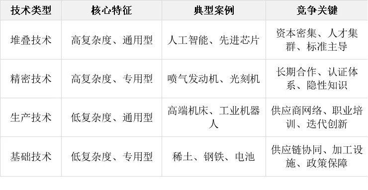 报告将技术划分为四类,提出“一技一策”的竞争逻辑: