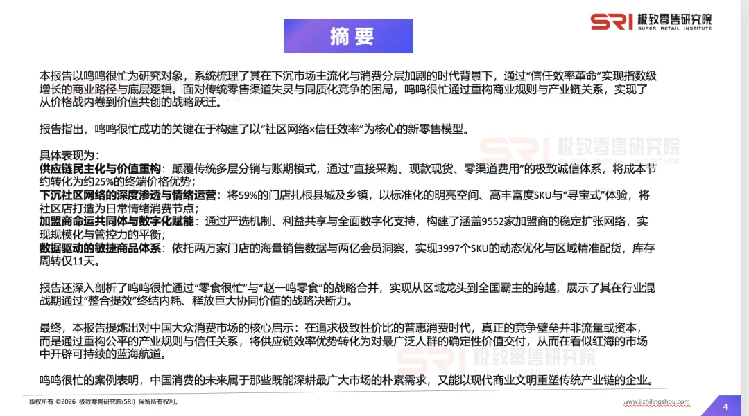 极致零售研究院(SRI)出品的一份关于折扣化连锁渠道演进路径的案例报告《鸣鸣很忙案例研究:零食量贩店如何重塑中国下沉市场零售生态》已正式发布。